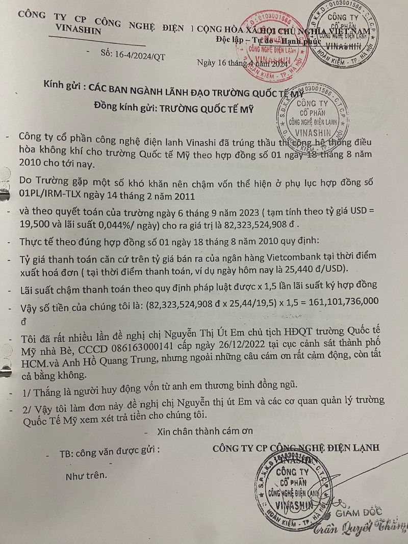 Công ty Cổ phần Công nghệ Điện lạnh Vinashin cho biết: lấy giá trị quyết toán của Trường Quốc tế Mỹ Nhà Bè thay tỷ giá USD từ 19,5 lên 25,44 đ và giá lãi trả chậm được nhân lên gấp 1,5 lần (theo quy định của Nhà Nước), bảng tính công nợ gốc, lãi Công ty Cổ phần Quản trị Tài Nguyên Tri Thức phải trả Công ty Cổ phần Công nghệ Điện lạnh Vinashin, Tạm tính cho đến hết ngày 31/12/ 2023 với Tỷ giá USD = 25,44 và lãi suất trả chậm là:161,1 tỷ đồng.