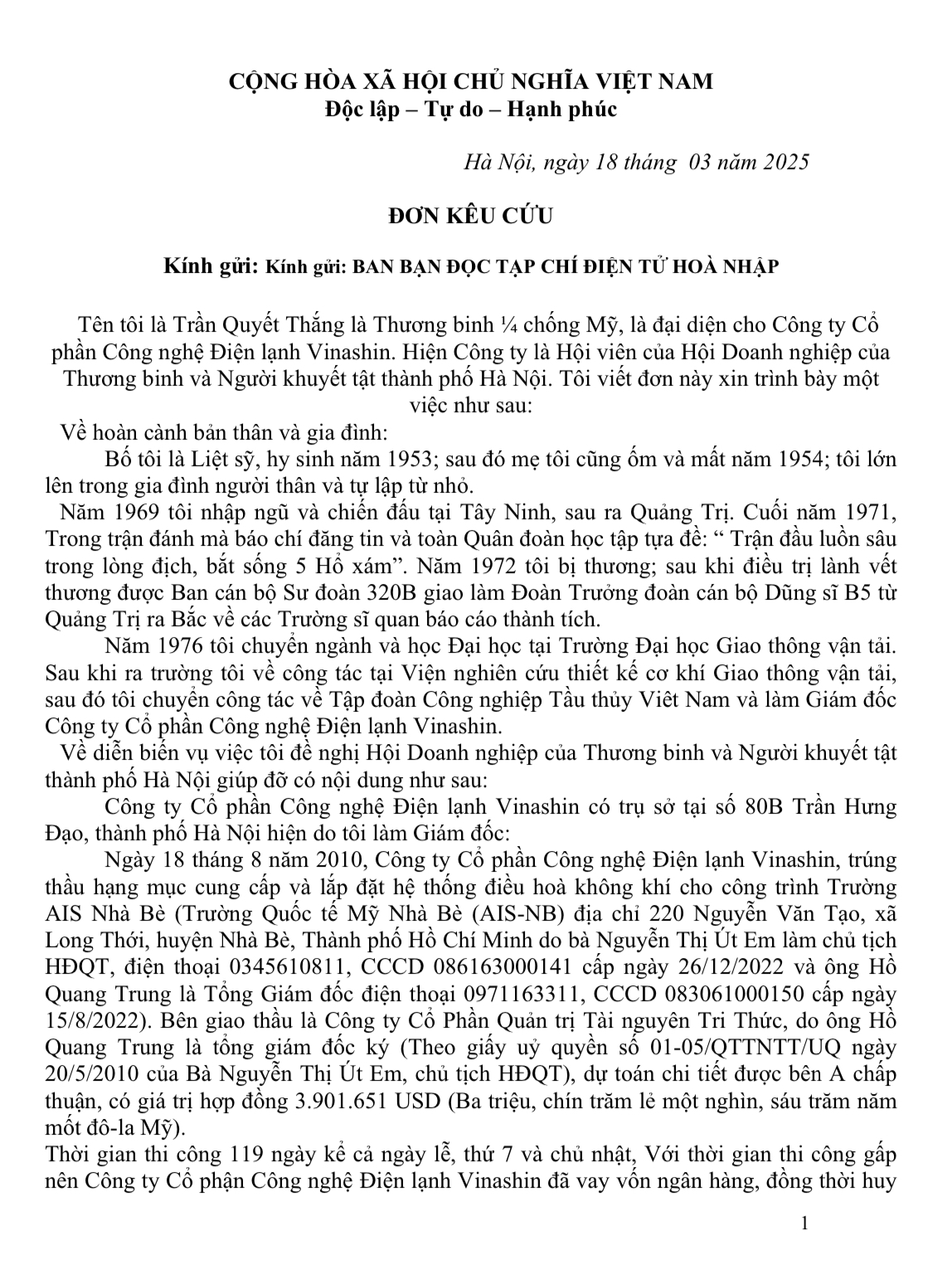 Đơn kêu cứu của thương binh Trần Quyết Thắng