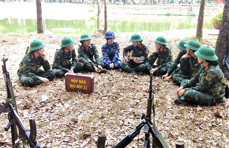 Đó là Binh nhì Hồ Thị Thùy Trang, chiến sĩ thuộc Tiểu đội 2, Trung đội 1, Đại đội 21, Tiểu đoàn 5. Tâm sự với chúng tôi, Trang cho biết em sinh năm 1994, sau khi tốt nghiệp ra trường em đi làm rồi tiếp tục học lên Cao học và đã hoàn thành chương trình Cao học ngành Quản trị kinh doanh; trước khi nhập ngũ em làm việc tại Ngân hàng Vietcombank. Phát huy truyền thống gia đình cho nên dù đã 27 tuổi; nhưng khi được chính quyền địa phương thông báo về việc tuyển chọn công dân nữ nhập ngũ năm 2021, em đã tình nguyện viết đơn nhập ngũ ngay, em mong muốn sẽ được phục vụ lâu dài trong quân đội và đem chút ít sức mình để góp phần xây dựng đơn vị, xây dựng quân đội và bảo vệ Tổ quốc.