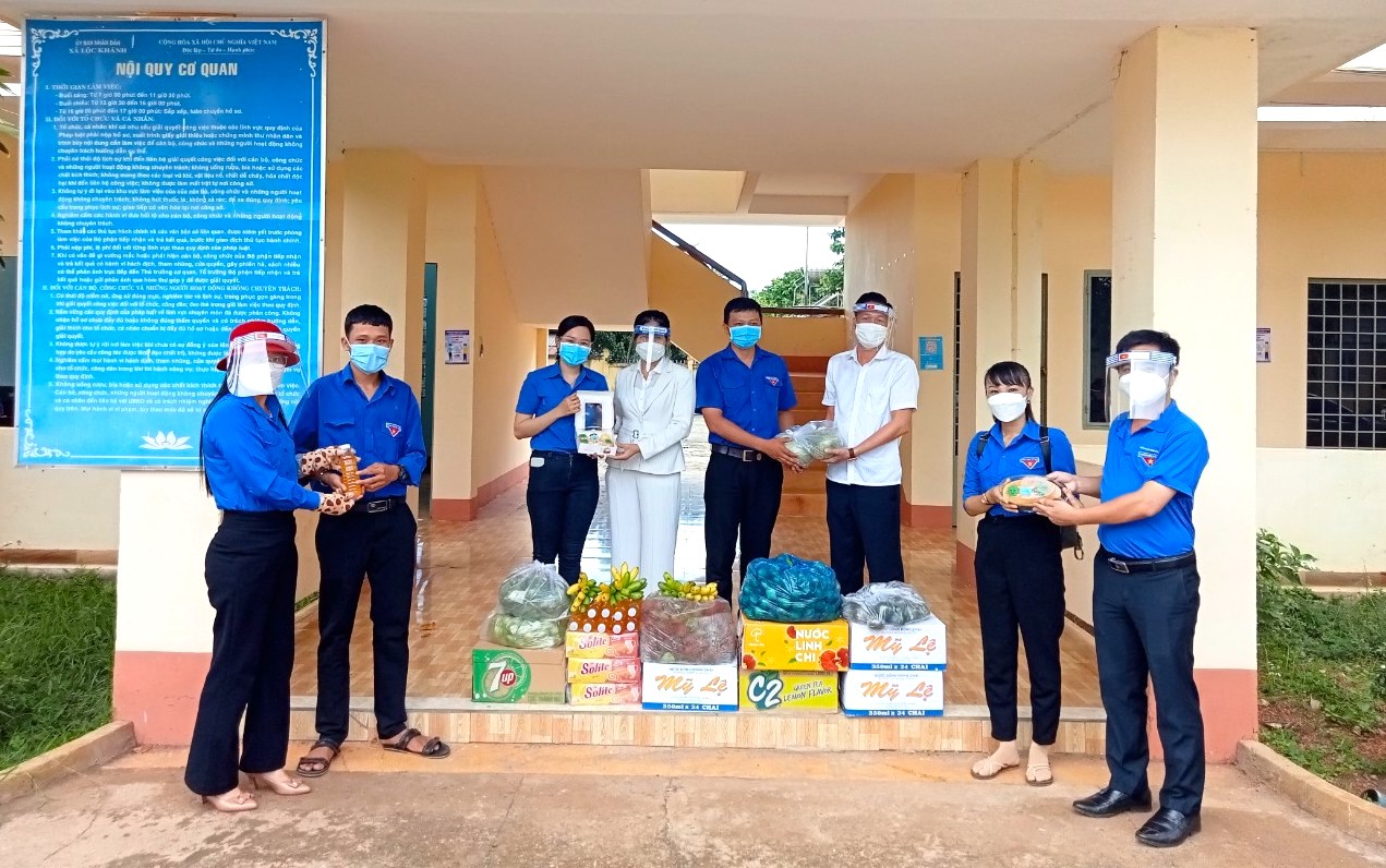 Chủ tịch Hội Nữ doanh nhân tỉnh Bình Phước Giang Thị Lan Thu (thứ 4, trái sang), Bí thư Tỉnh Đoàn Trần Quốc Duy (bìa phải) tặng bánh do anh Nguyễn Sỹ Hiền tự tay làm và quà cho thanh niên tình nguyện đi chống dịch tại huyện Lộc Ninh