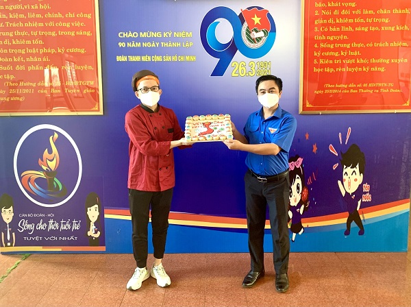 Anh Nguyễn Sỹ Hiền (bìa trái), anh Phạm Khắc Học - Giám đốc Công ty TNHH Bất động sản Kiên Cường Phát (thứ 2, phải sang) cùng Tỉnh Đoàn thăm, tặng quà và bánh cổ động cho HSSV tình nguyện đi “đuổi” COVID-19