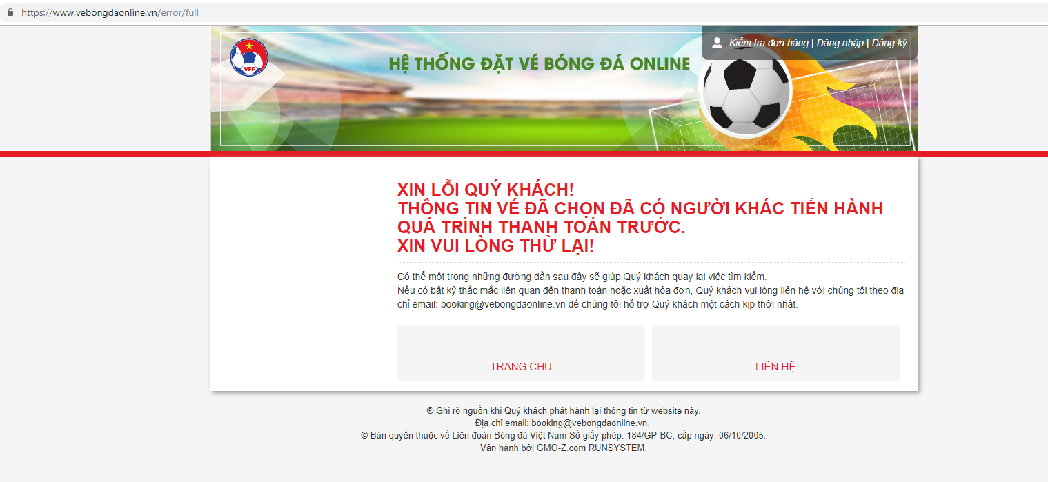 HOANHAP.VN - Ngay sau vài phút mở bán vé trận Bán kết lượt về AFF Cup của đội tuyển Việt Nam và Philippines thì hệ thống bán vé online của VFF đã gặp nhiều sự cố và thông báo hết vé.