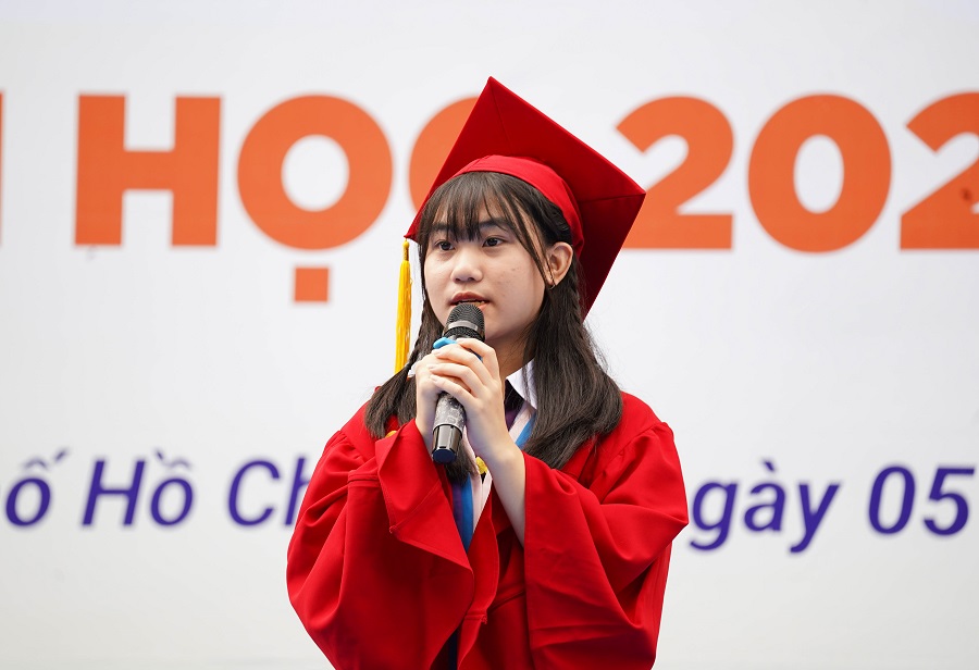 Em Trần Nguyễn Bảo Châu (học sinh lớp 10A1), đại diện các học sinh lớp 10, phát biểu tại lễ khai mạc nhà trường: “Hôm nay, em rất vinh dự khi đại diện các bạn học sinh cùng khóa, học sinh nhà trường phát biểu tại buổi lễ quan trọng và ý nghĩa này. Giờ đây nơi em đúng không còn là ngôi trường cấp 2 quen thuộc hôm nào, nơi đây là ngôi trường cấp 3 đầy mới mẻ, thú vị với nhiều điều mới đang đón chào. Mặc dù hành trình học tập phía trước còn nhiều khó khăn, thách thức nhưng em tin rằng dưới sự dẫn dắt của các thầy cô, đồng hành của gia đình và bạn bè, chúng em sẽ hoàn thành xuất sắc mục tiêu đề ra...”.