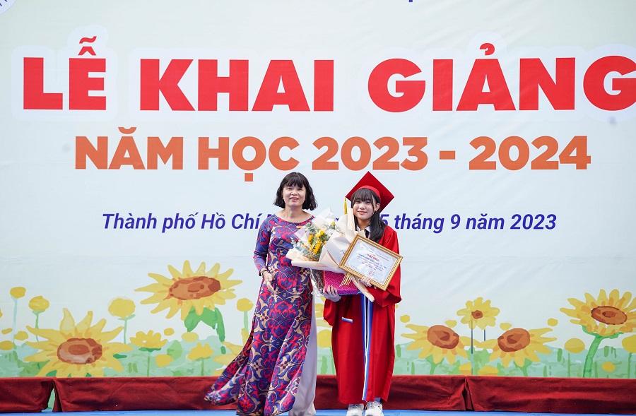 Bà Nguyễn Thị Hồng Chương (hiệu trưởng nhà trường) trao tặng giấy khen và quà cho em Trần Nguyễn Bảo Châu. Với 28,75 điểm đầu vào, Bảo Châu là thủ khoa kỳ thi tuyển sinh lớp 10 tại trường THPT Nguyễn Thị Minh Khai, năm học 2023 - 2024.