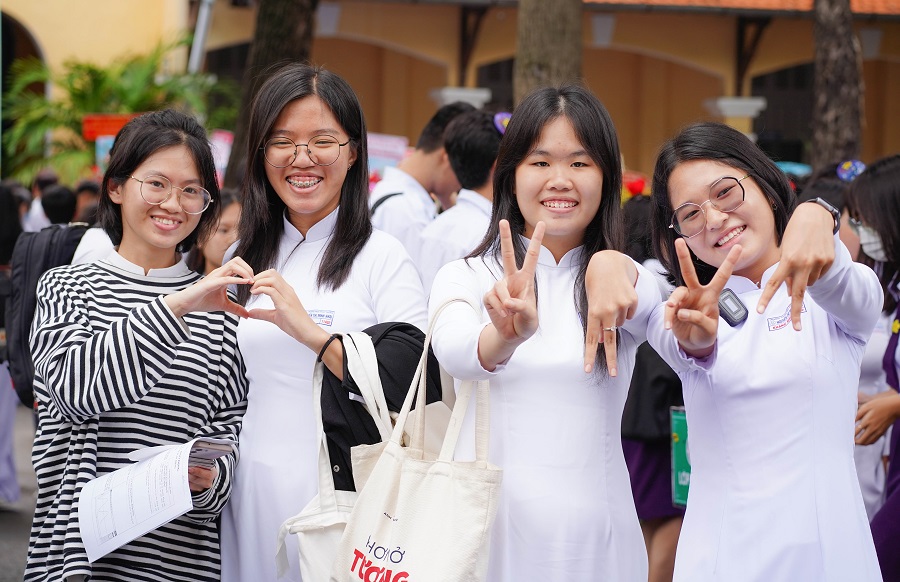 Nguyễn Hoàng Khang Như 11A2 (cánh phải), vui mừng cùng bạn bè chuẩn bị bước vào năm học 2023 - 2024: "Vào năm học mới với nhiều điều mới, nhận thức mới giúp em cảm thấy quý trọng các thầy cô, thời gian bên các bạn và thúc đẩy mình phải thật cố gắng cho năm học mới".