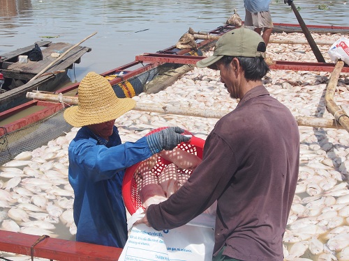 Đến ngày 17/5, cá của các hộ dân trên đã chết hết, số cá chết quá nhiều không bán kịp đã bốc mùi hôi thối. Người dân nuôi cá lồng bè vẫn đang nai lưng vớt cá, có những hộ nước cuốn trôi cả vèo cá đành ngậm ngùi chấp nhận trắng tay.