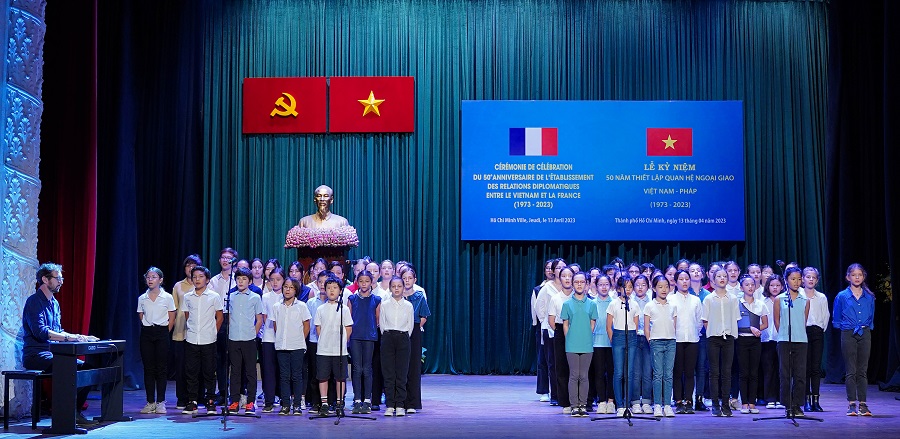 Hơn 50 em nhỏ là con em công dân Pháp tại TP Hồ Chí Minh tham gia biểu diễn âm nhạc tại buổi kỷ niệm.