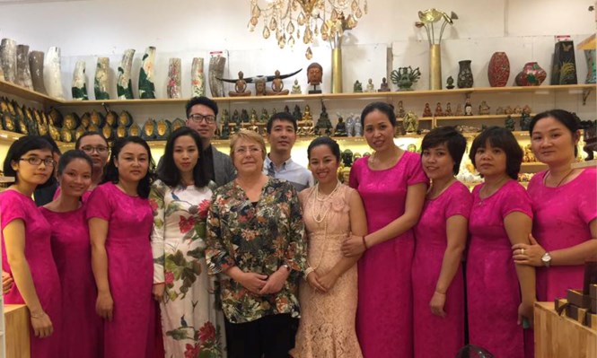 Tổng thống Chile Michelle Bachelet Jeria xem các sản phẩm lưu niệm của Việt Nam (nhạc cụ cổ truyền, tranh sơn mài, lụa...) trên phố Hàng Gai, Hà Nội.