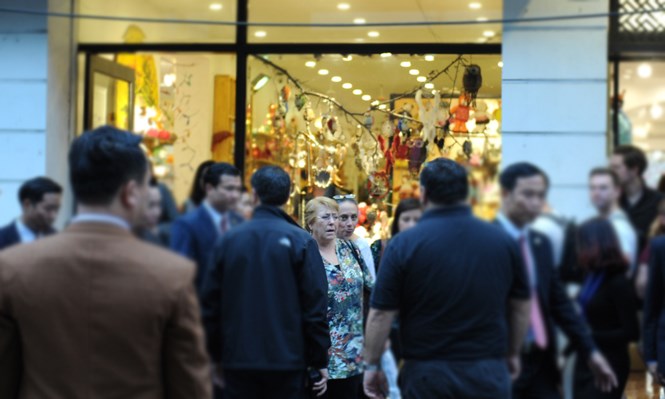Tổng thống Chile Michelle Bachelet cho biết, người Chile thường nói Việt Nam là một khách hàng quen thuộc và khi đi dạo phố và đã mua một số mặt hàng để đóng góp cho nền kinh tế Việt Nam. Ảnh Tienphong.vn