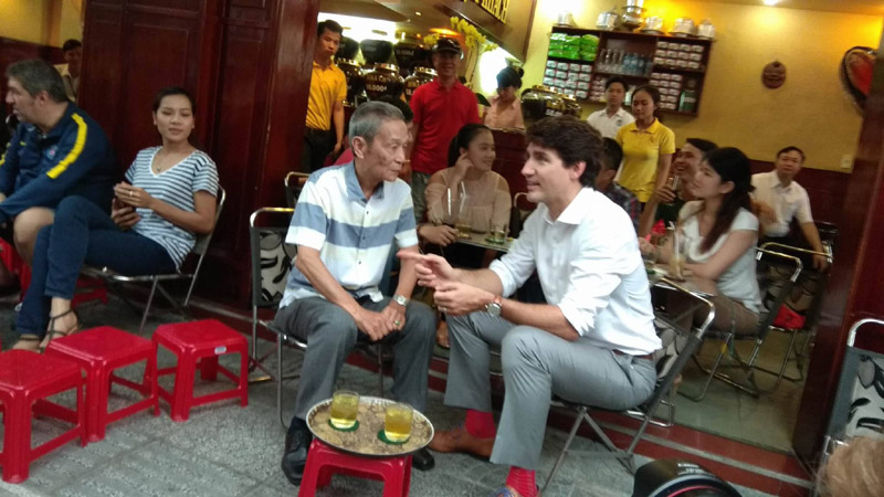 Đến thăm TPHCM, chiều 9/11, Thủ tướng Canada Justin Trudeau cùng một nhân viên người Việt Nam làm việc tại Tổng Lãnh sự quán Canada tản bộ và thưởng thức cà phê tại một quán nhỏ ở quận 1.