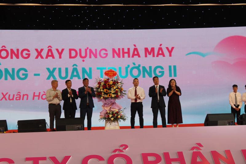 Lãnh đạo đảng ủy, HĐND, UBND xã Xuân Hòa, huyện Xuân Trường, tỉnh Nam Định tặng hoa chúc mừng Công ty CP May Sông Hồng tại lễ khởi công - Ảnh: Hồ Thanh