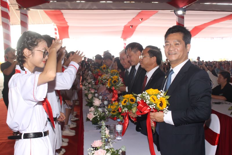 Các cháu thiếu nhi tặng hoa chúc mừng các đại biểu về dự lễ.
