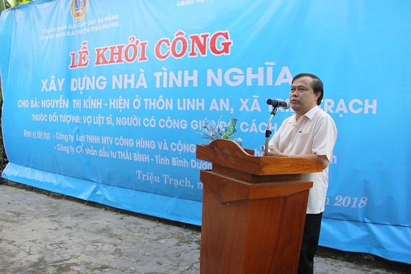 Tại lễ khởi công, ông Nguyễn Thành Vũ, Phó Chủ tịch UBND huyện Triệu Phong bày tỏ sự cảm ơn chân thành và đánh giá cao những nghĩa tình mà cán bộ TAND nói chung, TAND cấp cao tại Đà Nẵng, TAND huyện Triệu Phong nói riêng cùng các đơn vị tài trợ đã dành cho gia đình chính sách tại địa phương, giúp bà con vượt qua khó khăn, thiếu thốn, có cuộc sống ổn định hơn.