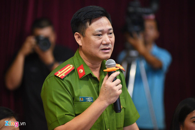 Trung tá Trần Văn Hóa, Phó trưởng Công an quận Cầu Giấy trả lời báo giới một số thông tin liên quan vụ án. Ảnh: Duy Hiệu.