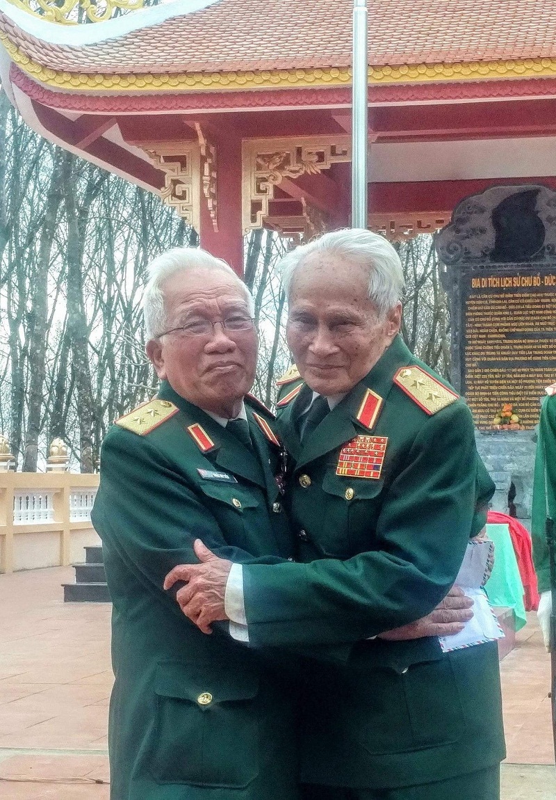 Trung tướng Khuất Duy Tiến và Trung tướng Nguyễn Quốc Thước chụp ảnh lưu niệm trong ngày khánh thành Bia Di tích lịch sử Chư Bồ-Đức Cơ