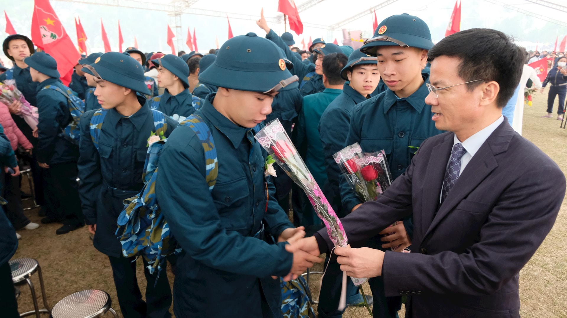Chủ tịch UBND thành phố Hà Nội Trần Sỹ Thanh tặng hoa, động viên các tân binh. (Ảnh: Báo Hà nội mới)