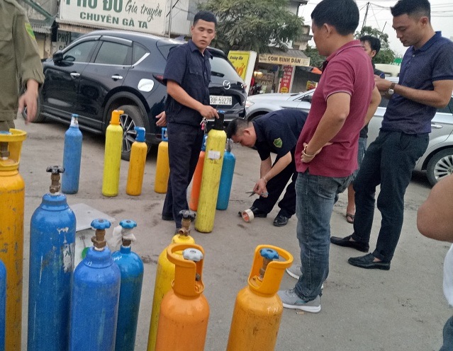 Cơ quan công an quận Nam Từ Liêm và Phường Tây Mỗ đang lập biên bản bắt giữ và đưa các bình khí đi giám định và làm các nghiệp vụ điều tra.