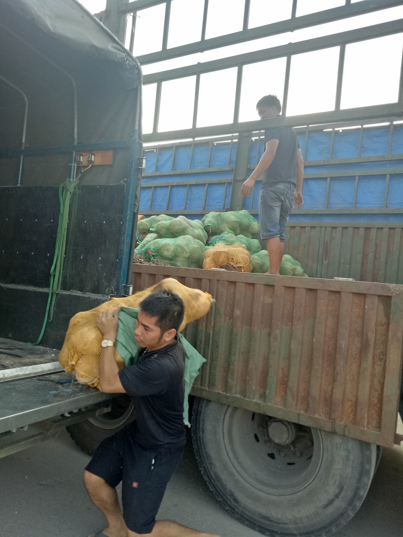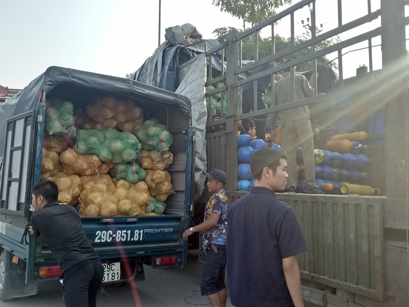 Chủ hàng bốc dỡ dừa để để lực lượng chức năng kiểm đếm số lượng bình khí