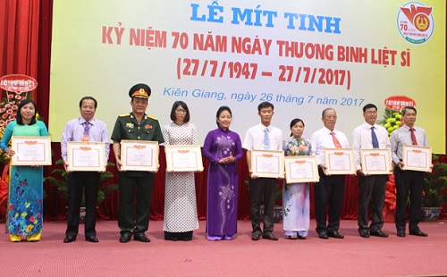Tỉnh Kiên Giang có 1.456 Bà mẹ Việt Nam anh hùng, trên 15.000 liệt sỹ, hơn 10.000 thương binh, bệnh binh. Tỉnh có trên 38.662 người tham gia kháng chiến hưởng chế độ trợ cấp một lần theo các Quyết định của Thủ tướng Chính phủ, trên 9.000 người có công giúp đỡ cách mạng và 1.874 người hoạt động kháng chiến bị nhiễm chất độc hóa học, 771 người hoạt động kháng chiến bị địch bắt tù, đày. Hiện hơn 34.000 người tham gia kháng chiến giải phóng dân tộc, bảo vệ tổ quốc và làm nhiệm vụ quốc tế được tặng thưởng Huân, huy chương kháng chiến.