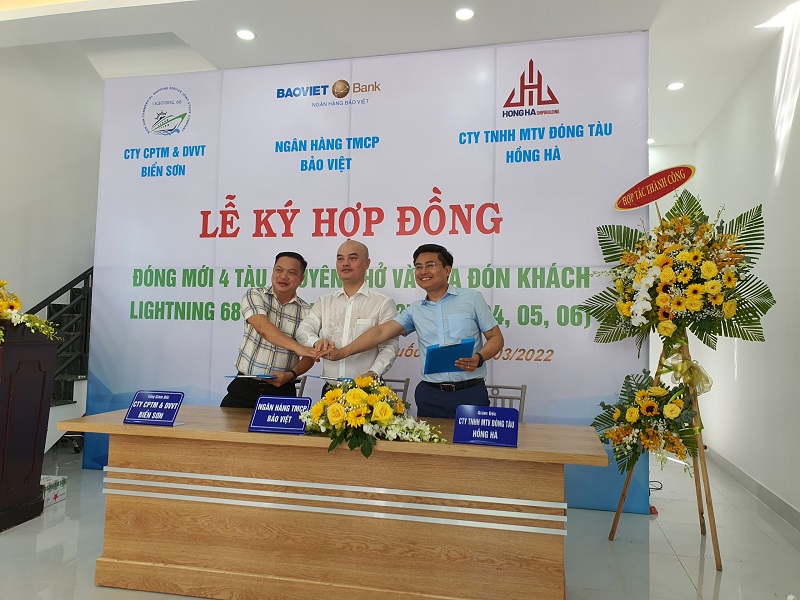 Tại buổi lễ, Công ty Cổ phần thương mại và dịch vụ vận tải Biển Sơn, Công ty TNHH MTV Đóng tàu Hồng Hà và Ngân hàng Thương mại Cổ phần Bảo Việt – Chi nhánh Cầu Giấy đã tiến hành ký kết Biên bản ghi nhớ 3 bên về việc cung cấp tín dụng cho gói thầu cùng hợp tác để triển khai Đóng mới 4 tàu, đảm bảo đúng tiến độ, chất lượng và hiệu quả. Tổng gói thầu đóng mới 4 tàu trị giá trên 328 tỷ đồng.