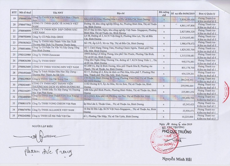 Cụ thể, Cục thuế tỉnh Bình Dương đã thông báo công khai thông tin 35 doanh nghiệp trên địa bàn nợ thuế với số tiền trên 653,6 tỷ đồng (đến tháng 6/2019). Tính đến thời điểm 31/5/2019, tổng số tiền thuế mà các doanh nghiệp trên địa bàn nợ thuế lên đến hơn 2.868 tỷ đồng (tăng 727 tỷ đồng so với thời điểm ngày 31/12/2018).