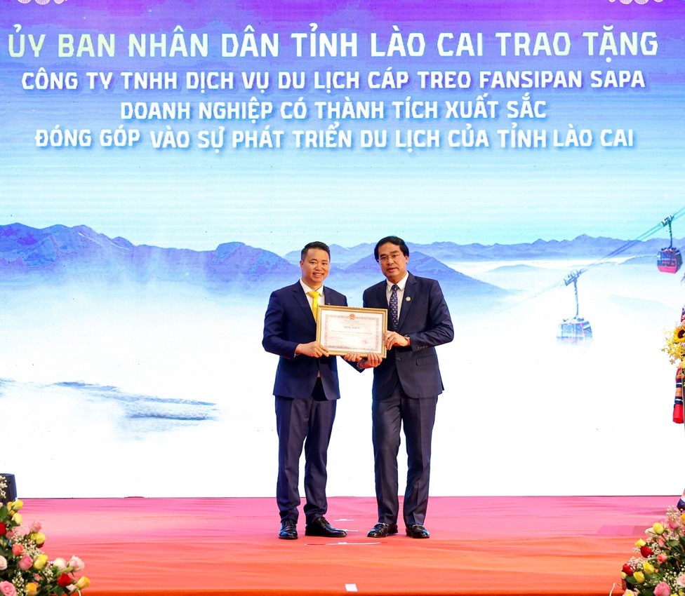 Ông Trịnh Xuân Trường - Chủ tịch UBND tỉnh Lào Cai (phải) trao bằng khen cho ông Nguyễn Xuân Chiến, giám đốc KDL Sun World Fansipan Legend, ghi nhận những đóng góp của doanh nghiệp với sự phát triển của du lịch tỉnh Lào Cai.
