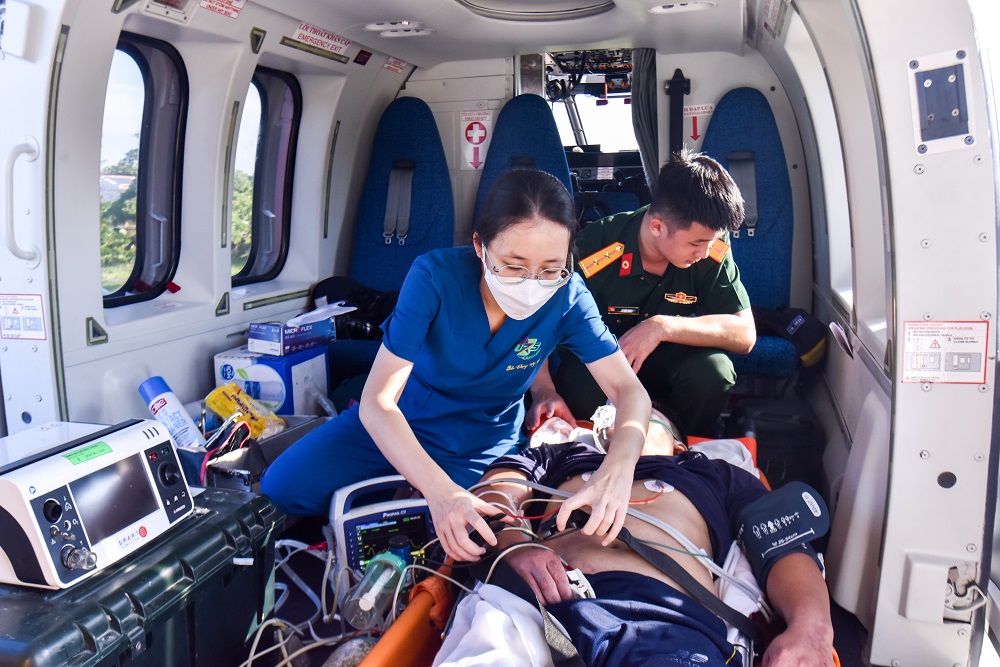 Trong quá trình bay ra đảo Song Tử Tây để vận chuyển bệnh nhân, Tổ cấp cứu nhận được lệnh của Thủ trưởng Bộ Quốc phòng vận chuyển thêm 1 bệnh nhân bị đa chấn thương: chấn thương sọ não nặng, gãy kín 1/3 xương giữa đòn trái do ngã cao giờ thứ 1. Khi tiếp nhận, bệnh nhân trong tình trạng hôn mê, Glasgow 5 điểm, đồng tử trái giãn 5mm, PXAS (-), đồng tử phải co nhỏ, Mạch: 69l/p; HA: 115/70mmHg, SpO2: 98%. Bệnh nhân được đặt ống nội khí quản, thở máy và vận chuyển cùng bệnh nhân N.S. trên một chuyến bay về đất liền điều trị.