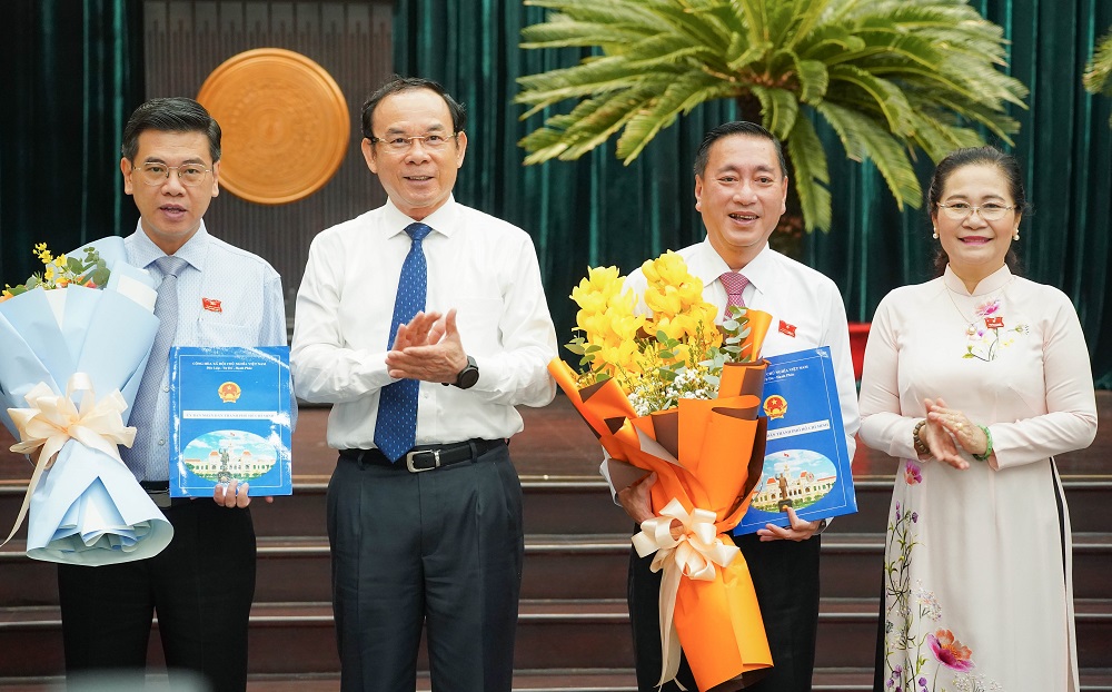 Bí thư Thành ủy TP Hồ Chí Minh Nguyễn Văn Nên (thứ hai phía trái) và Chủ tịch HĐND TP Hồ Chí Minh Nguyễn Thị Lệ trao quyết định, hoa chúc mừng hai cán bộ chính thức nhận nhiệm vụ mới - Ảnh: Thuận Văn
