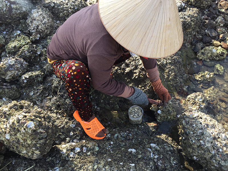 Người dân đẽo đá để lấy hàu sữa