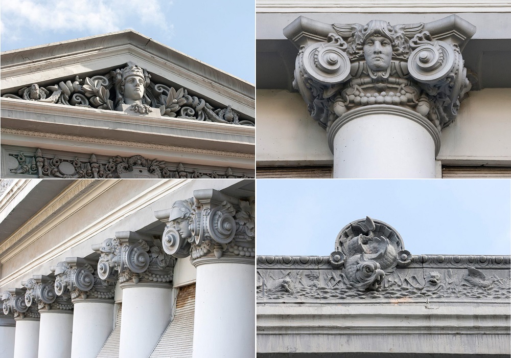 Phù điêu trang trí ở 4 bề tòa nhà mang kiểu kiến trúc Hy Lạp, La Mã cổ đại.