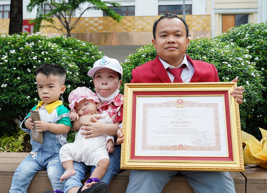Vận động viên khuyết tật Trần Văn Nguyên hạnh phúc bên gia đình nhỏ của mình. Với những lực, cố gắng đạt được nhiều thành tích đáng ghi nhận tại các giải đấu thể thao trong nước và quốc tế. Anh vừa nhận được bằng khen từ Thủ tướng Chính phủ trao tặng trong sáng 16/4.