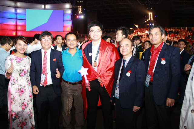 | Thí sinh Nguyễn Bá Phước (đứng giữa khoác cờ) chụp ảnh cùng với lãnh đạo đoàn Việt Nam. |