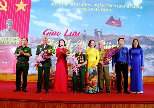 Các đ/c lãnh đạo Hội CCB, Hội Phụ nữ và Đoàn thanh niên Quận Hà Đông tặng hoa chúc mừng các đại biểu Chiến sĩ Điện Biên. |