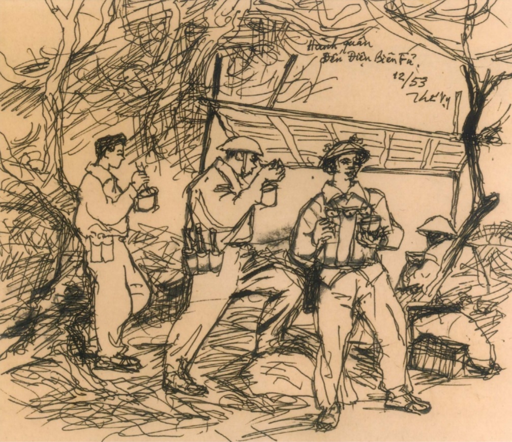 Tôi đem đến cho anh phiên bản của một số Ký họa thời chiến dịch Trần Bình mà tôi còn lưu giữ được, và ảnh chụp bức tranh sơn dầu tôi vừa vẽ xong dựa trên Ký ức và tài liệu của riêng tôi thời đó – Bức "Hùng khí Điện Biên" mô tả sinh hoạt của bộ đội ta khi đang bao vây địch trong lòng chảo Mường Thanh – Hồng Cúm – Cảnh ở bìa rừng, ven suối, tốp bộ đội hạ cây, vác cột để đi xây dựng trận địa, che phủ nóc hào nóc hầm; không khí sôi nổi của ván tu lơ khơ (một đặc điểm của thú giải trí lành mạnh của quân ta thời đó); tốp chuẩn bị bộc phá đánh lô cốt địch (bộc phá loại này đã không phá được cái lô cốt ngắm ở đồi A1, nên sau phải đào đường hầm đánh cả tấn thuốc nổ để bóc bằng được cái cao điểm cuối cùng của địch), dáng rủ rũ thất thếu của 2 tên tù hàng bình Âu Phi; niềm hoan hỉ của anh thương binh trẻ được ông lão dân công xe thồ chia sẻ điếu thuốc lào... Những hình ảnh quen thuộc của một thời dữ dội, hào hùng.
