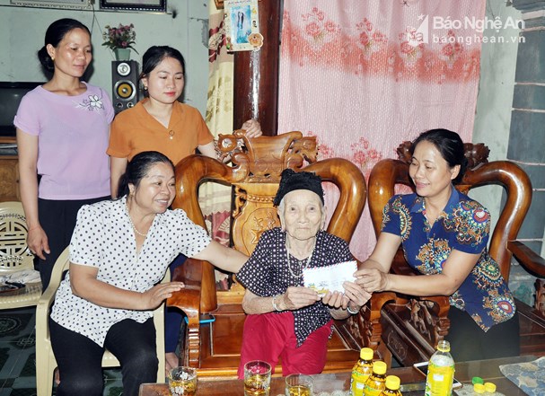 | Cán bộ Hội LHPN xã Cẩm Sơn thăm hỏi, tặng quà Mẹ Việt Nam anh hùng Vi Thị Quý nhân kỷ niệm ngày Thương binh - Liệt sỹ (27/7). Ảnh: Công Kiên |