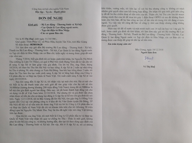 Sau khi từ Ả rập Xê út trở về, chị Vi Thị Huệ (quê quán: thôn Phúc Lễ, xã Phúc Hòa, huyện Tân Yên, tỉnh Bắc Giang) tìm đến toà soạn Tạp chí điện tử Hoà Nhập gửi đơn đề nghị giúp đỡ. Nội dung đơn, chị Huệ trình bày: