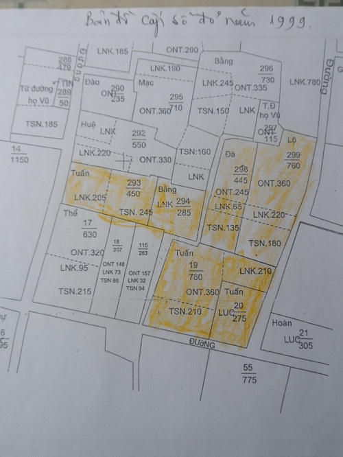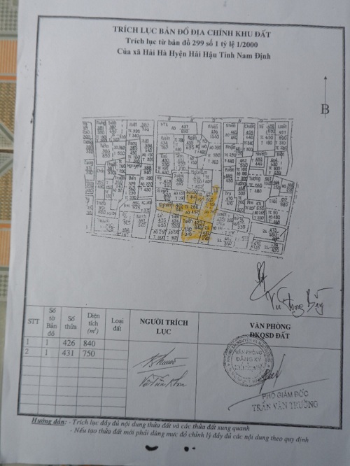 | Bản đồ địa chính khu đất trích lục từ tờ bản đồ 299 của xã Hải Hà tại Văn phòng đăng ký quyền sử dụng đất huyện Hải Hậu (Nam Định). |