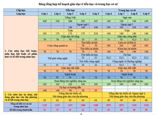 Nhiều chuyên gia nhận định tổng số môn học dường như quá “đồ sộ” và số tiết học cũng quá lớn. Thậm chí, học sinh lớp 10 có tới 15 môn học bắt buộc và tự chọn bắt buộc, chưa tính 2 môn tự chọn. Tổng số tiết trong một năm học từ 985 tiết đến 1.184 tiết học.