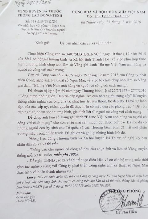 Mang danh nghĩa “làm sổ vàng ghi danh cho Bà mẹ Việt Nam anh hùng và người có công với cách mạng” miễn phí nhưng hai công ty ảnh kỹ thuật số đã lợi dụng thu tiền người dân một cách bất chính.
