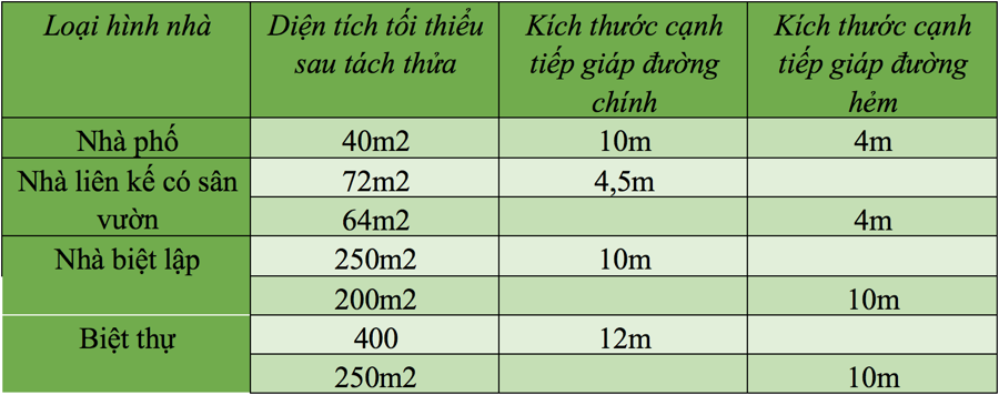 Nhà biệt lập: diện tích từ 250m2 trở lên và có kích thước cạnh tiếp giáp đường từ 10m trở lên đối với đường chính; tại các đường hẻm diện tích từ 200m2 trở lên và kích thước cạnh tiếp giáp đường từ 10m trở lên.