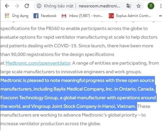 Vingroup là một trong 3 đơn vị Medtronic xác nhận đã đàm phán sâu về chuyển giao công nghệ máy thở
