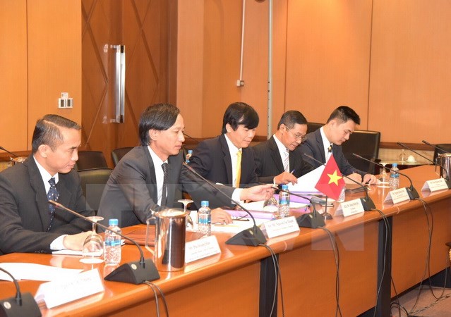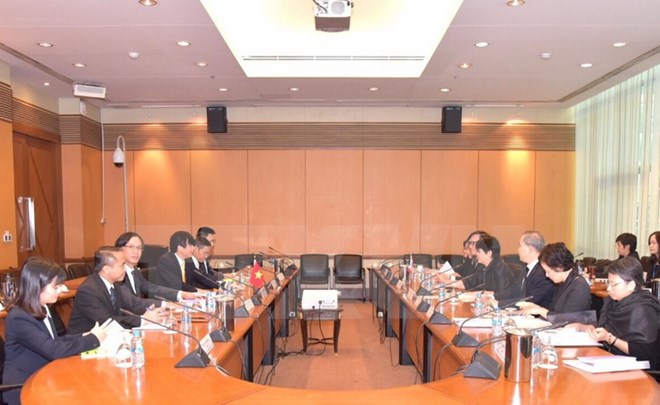 Thứ trưởng Bộ Ngoại giao Đặng Đình Quý và Bí thư Thường trực Bộ Ngoại giao Thái Lan Busaya Mathelin tại cuộc họp. (Ảnh: Sơn Nam/ TTXVN)