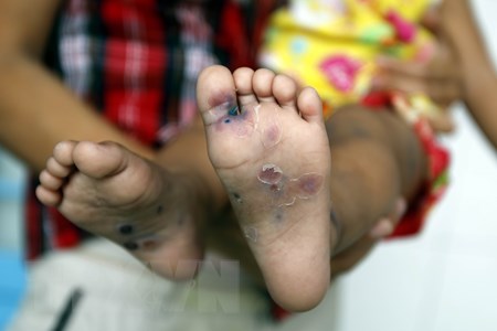 Ở lòng bàn tay, lòng bàn chân có những nốt phỏng nổi cộm lên mặt da, cứng, chắc, những nốt này thường khô và đóng vảy sau 2. 3 ngày,sau đó bong ra.