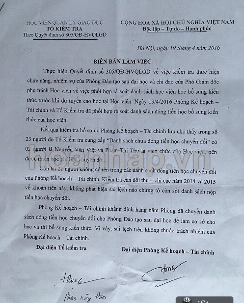 Để làm rõ việc vì sao 23/51 học viên chưa nộp tiền, ngày 5/5/2016, Phòng Kế hoạch - Tài chính đã phải có tờ trình Giám đốc Học viện QLGD cho phép Phòng Kế hoạch - Tài chính cùng Ban Thanh tra pháp chế nhà trường trực tiếp xuống lớp cao học này để kiểm tra và đôn đốc các học viên chưa thực hiện nghĩa vụ tài chính đối với Học viện. Và kết quả kiểm tra thật bất ngờ, cả 23/51 học viên đều xác nhận đã nộp cho ông Phạm Hiển - cán bộ Phòng Đào tạo sau đại học và nhờ ông Hiển thay mặt nộp hộ cho bộ phận kế hoạch - tài chính. Số học viên này còn khẳng định ông Hiển đã nhận tiền và có ghi tên vào danh sách nộp tiền nhưng không có chữ ký của học viên. Sau đó cũng không một ai trong số 23 học viên này nhận được thẻ học viên và biên lai thu tiền. Vậy số tiền này, ông Phạm Hiển - cán bộ Phòng Đào tạo sau đại học Học viện QLGD đã nộp cho ai hay cá nhân ông sử dụng vào việc gì khi 23/51 học viên lớp cao học đã trót đặt trọn niềm tin vào ông?