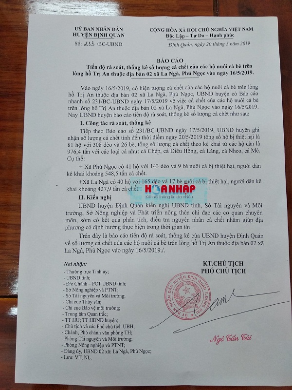 | Báo cáo tiến độ rà soát, thống kê số lượng cá chết của các hộ nuôi cá bè trên lòng hồ Trị An thuộc địa bàn 02 xã La Ngà, Phú Ngọc vào ngày 16/5/2019. |