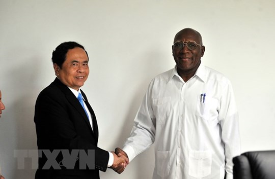 | Ủy viên Bộ Chính trị, Phó Chủ tịch thứ nhất Hội đồng Nhà nước và Hội đồng Bộ trưởng Cuba Salvador Valdés Mesa tiếp Bí thư Trung ương Đảng, Chủ tịch Ủy ban Trung ương Mặt trận Tổ quốc Việt Nam Trần Thanh Mẫn. (Ảnh: Vũ Hà/TTXVN) |