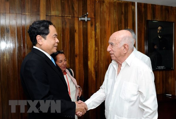 | Bí thư thứ hai Trung ương Đảng Cộng sản Cuba José Ramón Machado Ventura tiếp Bí thư Trung ương Đảng, Chủ tịch Ủy ban Trung ương Mặt trận Tổ quốc Việt Nam Trần Thanh Mẫn. (Ảnh: Vũ Hà/TTXVN) |
