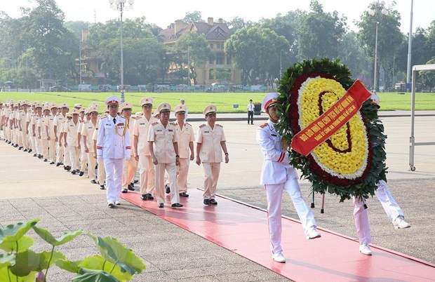 | Đoàn đại biểu Đảng ủy Công an Trung ương đặt vòng hoa và vào Lăng viếng Chủ tịch Hồ Chí Minh. (Ảnh: Dương Giang/TTXVN) |