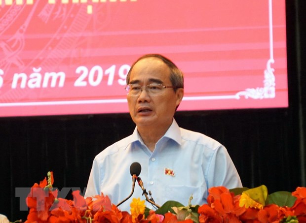 | Ủy viên Bộ Chính trị, Bí thư Thành ủy Thành phố Hồ Chí Minh, Trưởng Đoàn đại biểu quốc hội Thành phố Nguyễn Thiện Nhân phát biểu tại buổi tiếp xúc cử tri. (Ảnh: Thu Hoài/TTXVN) |