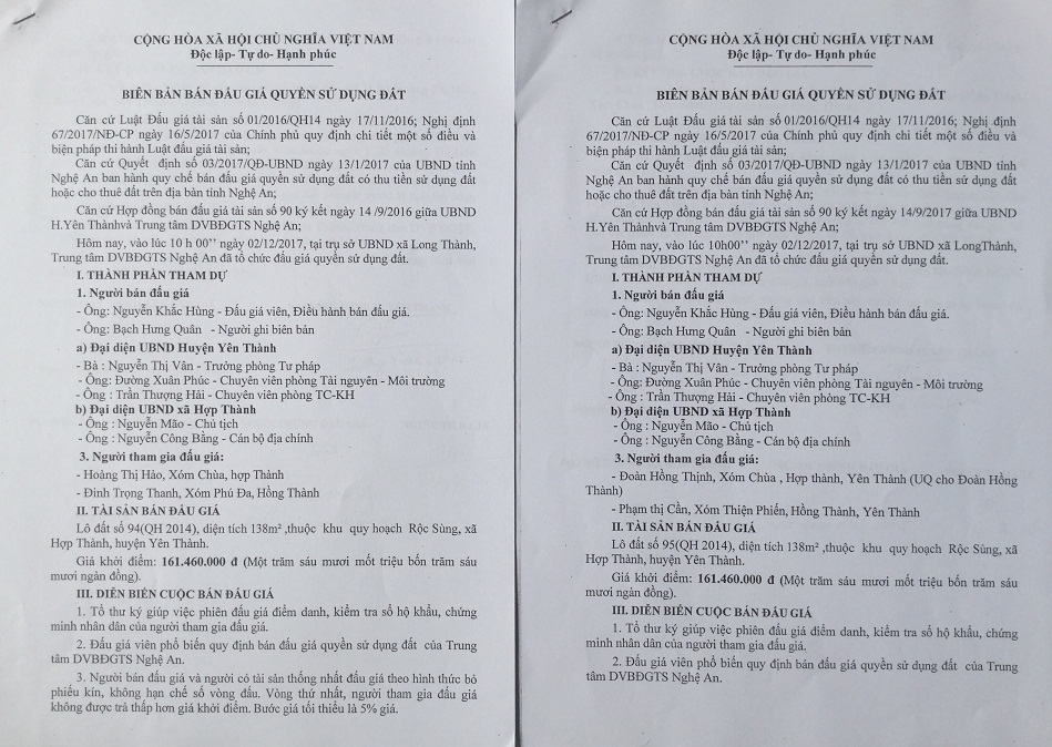 Theo hồ sơ giao đất và đấu giá đất nêu trên mà phóng viên thu thập được, tại phiên đấu giá lô đất số 90, số 94, số 95 của xã Hợp Thành tại xã Long Thành vào ngày 02/12/2017, bà Vân (lúc đó là Trưởng phòng Tư pháp) đại diện cho UBND huyện Yên Thành được giao giám sát phiên đấu giá. Kết quả trúng đấu giá và người được thụ hưởng cho thấy có dấu hiệu tiêu cực. Vậy thì, với vai trò thẩm định hồ sơ, giám sát phiên đấu giá, bà Vân chẳng lẽ vô can?